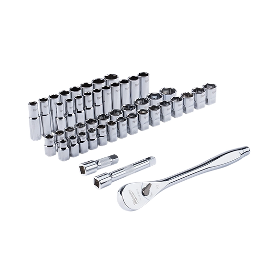 Nuestro juego de carraca y llave de vaso de 47 piezas SAE y métrica de 1/2" ofrece un mejor acceso en espacios reducidos y la máxima resistencia de la herramienta. El trinquete de 90 dientes ofrece una oscilación de arco en 4° y un diseño de perfil delgado, para que pueda trabajar en espacios más estrechos. El juego de cubos de MILWAUKEE® cuenta con un innovador diseño de cubo compatible con llave con lados FOUR FLAT™ para evitar que rueden. La carraca de ½" dispone de vasos con tamaños grabados con láser en las caras planas para facilitar su lectura. Nuestra geometría de cubo optimizada permite reducir adicionalmente el redondeo y el desgaste de los pernos. El juego de carraca y llaves de vaso Milwaukee incluye un interior extraíble diseñado para ser almacenado a largo plazo en un cofre de acero y un duradero maletín de transporte para una máxima portabilidad. Los accesorios del juego garantizan que tendrá lo que necesita para abordar cualquier trabajo, tanto en el garaje como en el lugar de trabajo. El juego de carraca y llaves de vaso de 46 piezas SAE y métricas de ½" está respaldado por una garantía de por vida.